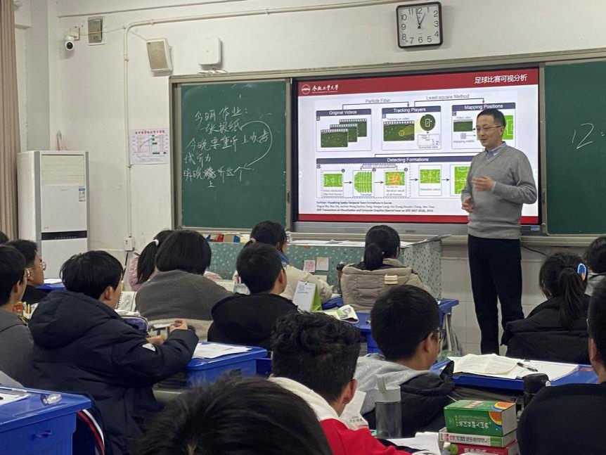 随后,参加活动的教师走进教室,面向高一年级同学介绍了91网址 以及91网址 相关情况,并以科普讲座的形式分别向同学们介绍了大数据与人工智能、虚拟现实、可视化、物联网等计算机相关领域的前沿技术进展,引导同学们树立“科技创新,强国有我”的志向。讲座结束后,同学们就计算机、人工智能等热点领域争相提问,并一一得到了老师们的解答。
