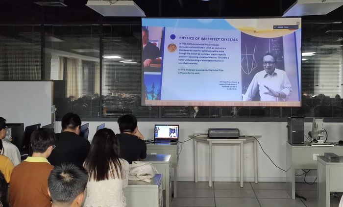 在学校侧,学院五位教师组织同学们在直播大厅,全程观看了介绍。同学们近距离感受了信息与通信技术的发展脉络、杰出成果、贝尔实验室的文化和魅力。在交流互动环节,黄博士就大学生如何投身科研工作,从能力储备方面给出了宝贵的建议。