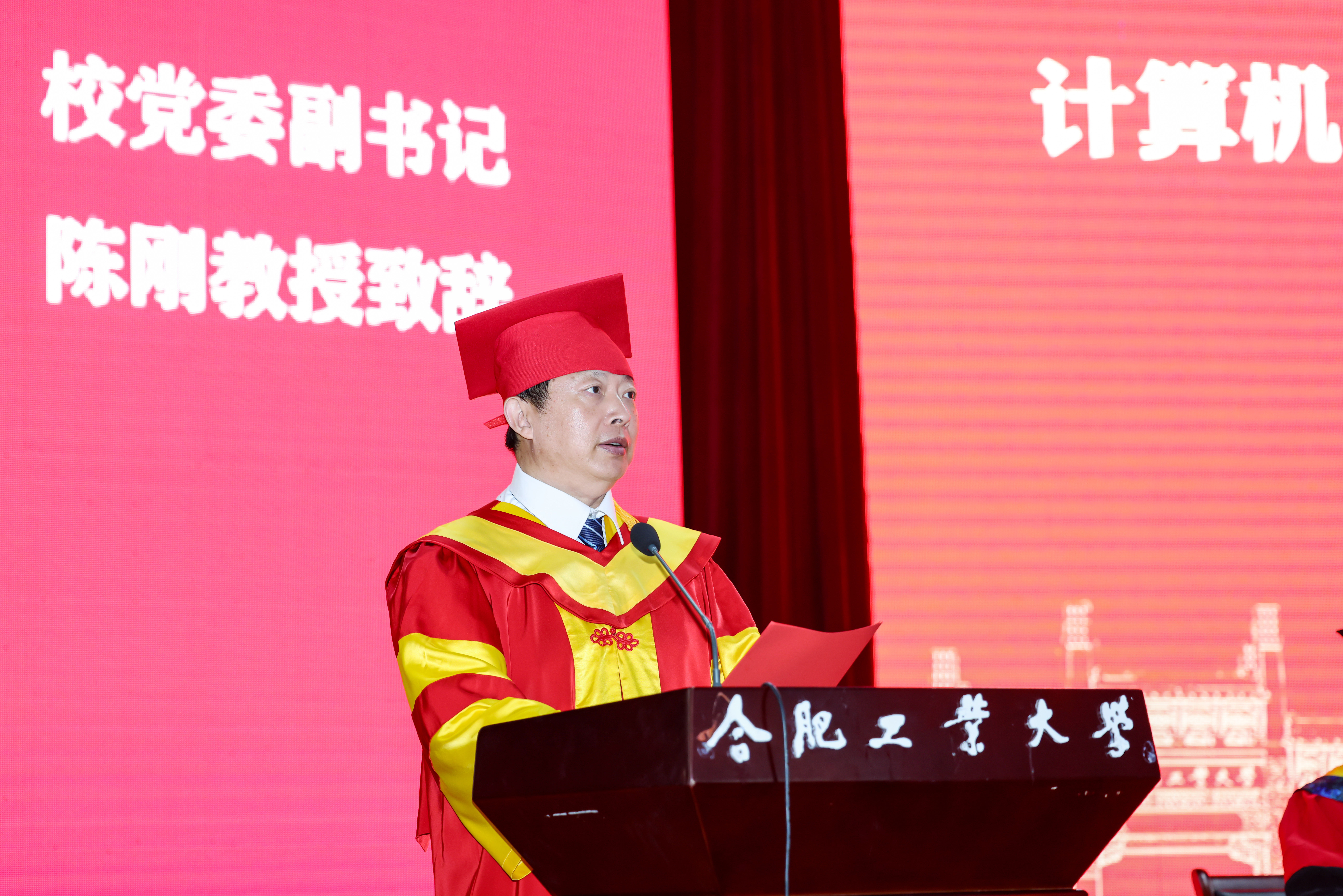 陈刚深情寄语毕业生,向全体毕业生提出三点希望,一是以真理为依归,在矢志不渝、笃行不怠中坚定理想信念。继续传承工大人工业报国之精神,主动接过中华民族伟大复兴的“接力棒”,走好新时代的“长征路”,将个人的“小目标”融入党和国家事业的“大蓝图”,积极为社会主义现代化国家建设特别是工业强国建设贡献自己的力量;二是以求是为底色,在攻坚克难、勇往直前中苦练过硬本领。作为工大学子,要继续勤学苦练、增强本领,在解决“卡脖子”技术难题和攻克关键共性技术难题中绽放青春光彩,积极解答时代之问、中国之问。三是以乐观为基调,在艰难险阻、世事磨砺中保持身心健康。要涵养道德修为,心有所畏、言有所戒、行有所止;要不断锤炼意志力、自制力、抗挫力,保持从容乐观;要开阔视野和胸襟,不为一时一事所惑,不为风险所惧,勇敢面对挑战。最后祝福毕业生一帆风顺、前程似锦、梦想成真。