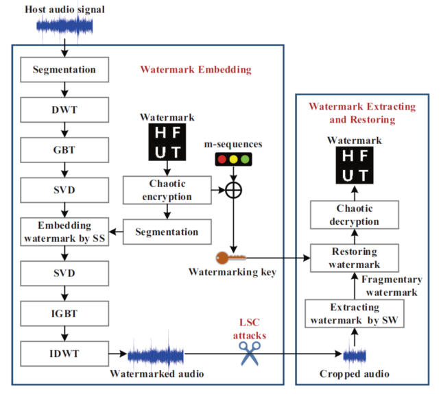 在各种短视频平台中,人们经常截取多个流行音乐片段编辑成共享视频的背景音乐,这给音频版权保护带来了极大挑战。论文提出了一种基于扩频的音频水印方案,尝试从理论和实验两个维度提升音频水印抵抗大规模裁剪攻击的鲁棒性。具体而言,首先对载体音频进行离散小波变换、图变换和奇异值分解以提取变换系数,然后利用扩频技术将混沌加密水印嵌入到变换系数中。特别的,将m序列与加密水印相结合生成水印密钥,以利用m序列的周期性从理论上保证残缺水印的自恢复特性。此外,设计了一种有效的滑动窗口策略,以取代同步机制从变换系数中提取残缺水印,并通过水印密钥恢复出完整水印,从而进行版权确认和溯源。