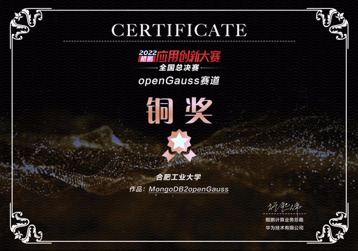 HFUT队(成员:靳凯程、杨辰、李智、李昕书、王妍)经过区域赛、半决赛和总决赛(长达3个月)的层层筛选与激烈角逐,最终在openGauss赛道中斩获全国总决赛铜奖和上海区域赛金奖,团队提出的MongoDB2openGauss项目方案得到专家的一致好评。在该赛道中,仅有华中科技大学、91网址