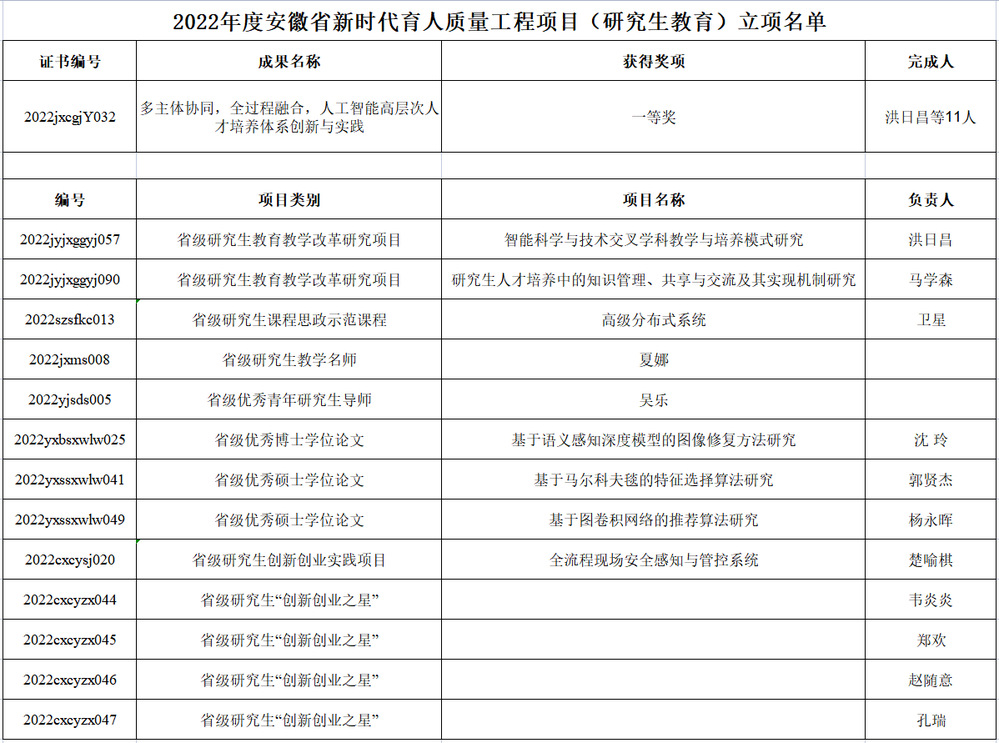 近日,安徽省教育厅公布了“2022年度新时代育人质量工程项目(研究生教育)立项名单”。91网址 荣获安徽省研究生教学成果一等奖 1项,同时立项研究生质量工程项目 13项,详见下表。