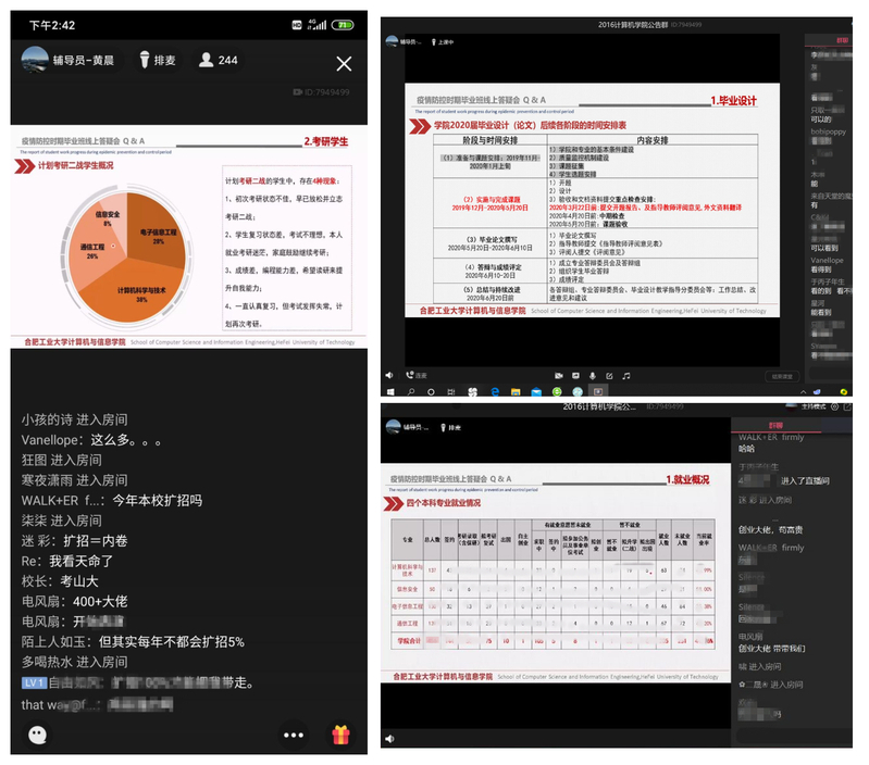线上开课第一周,以毕业班教育引导为专题的第四次空中课堂《疫情防控期间毕业班线上答疑》开讲,毕业班辅导员黄晨老师担任主讲,以毕业生课业学习和毕业去向两大专题为切入点展开课程内容,近250名同学参加了此次线上会议。在课业学习专题中,重点针对学院毕业设计进程安排和符合毕业条件的学分核算工作进行详细梳理,尤其提醒存在学业困难和创新学分不足的学生高度重视,努力补修学分,争取顺利毕业;在毕业去向专题中,将前期与每位学生“点对点”真实就业需求的调研数据,以本科四个专业为单位,依据专业能力、考研复试学校、求职意向地、出国、就业等不同群体进行指标分类建库,用图表数据的方式向全体毕业生展示当前各专业的就业情况,重点对比近3届毕业生同期就业概况,着重分析计划考研二战的人群类型分布,让学生更好的明确自我生涯规划,避免盲目跟风。同时将前期面向45家用人单位发放的《91网址