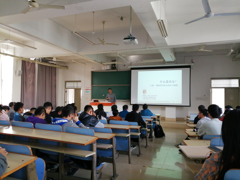 做了题为“九真——网络空间安全成长与循路”的报告。网安所胡东辉所长主持报告,学院信息安全专业大一、大三本科生以及相关教师到场聆听并交流学习。