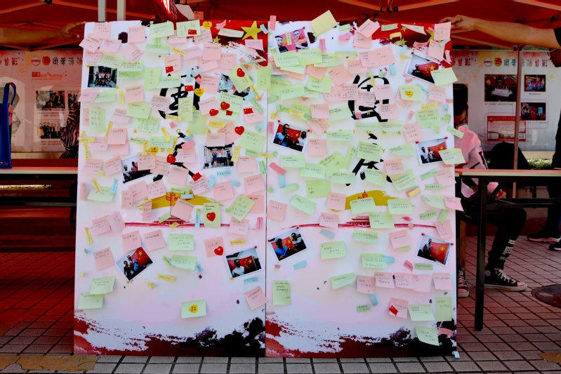 的辅导员们及学校的留学生们,辅导员们在平日的日常学习生活中为同学们树立了爱国榜样,留学生们也表达了对中国的喜爱和祝福。活动最后,每一位参加活动的同学们都收到了写着“I love China”等字样的贴纸作为纪念。
