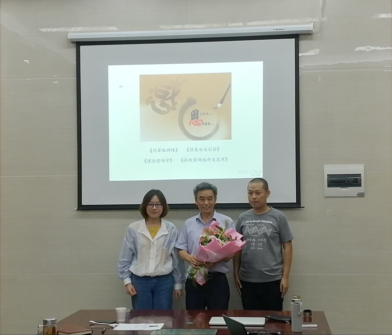 此次欢送会由网络与信息安全研究所所长胡东辉老师主持。胡所长在会上高度赞扬了侯整风教授几十年来在工作岗位上的辛勤奉献,并代表全体研究所的教职工对侯教授的辛勤付出表示感谢。侯教授在会上分享了自己四十多年的教学经历和人生感悟。最后,由信息安全第一届优秀毕业生陈宇副研究员和2015级信息安全专业学生代表黄梦洁为侯教授送上鲜花,表示同学们对侯老师的感谢与由衷的敬意。
