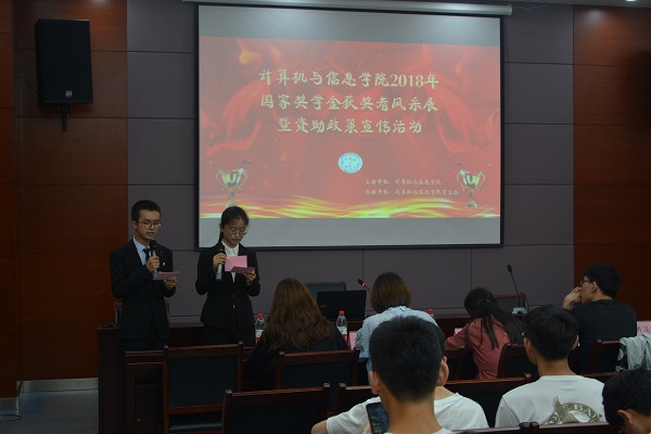 在翡翠科教楼第五会议室开展国家奖学金获奖者风采展示暨资助政策宣讲会。学院相关负责老师、高年级获奖同学、全体低年级本科生学生代表出席本次活动。