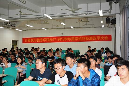 2017-2018学年团学组织换届选举大会在翡翠湖校区三教106成功举办。本次大会由学院团委书记及各年级辅导员和往届主席团成员担任主要评委,学院团学组织所有成员出席了本次换届选举,现场气氛热烈。