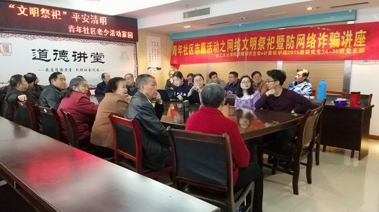 2017年3月27日,计算机学院研究生会与计算机学院15级34-35班党支部共同走进包公街道青年社区展开网络文明祭祀暨防网络诈骗讲座,此活动主要针对社区中老年群体。