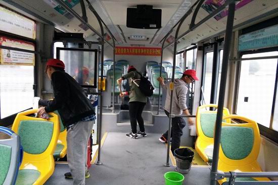 本次活动于上午10点30开始,志愿者们利用公交车停在底站时的空闲时间,拿着自带的清洗工具清扫226公交车。志愿者们先用抹布清洗车窗玻璃和座位,再对整个车厢进行清扫。大家分工明确,活动有序进行。在短短的15分钟后,公交车里外都被清理了一遍,最后呈现出了干净清爽的车厢环境。此次环保活动历时一个小时,志愿者们一共清理了3辆公交车。活动结束后获得了司机们的一致好评。