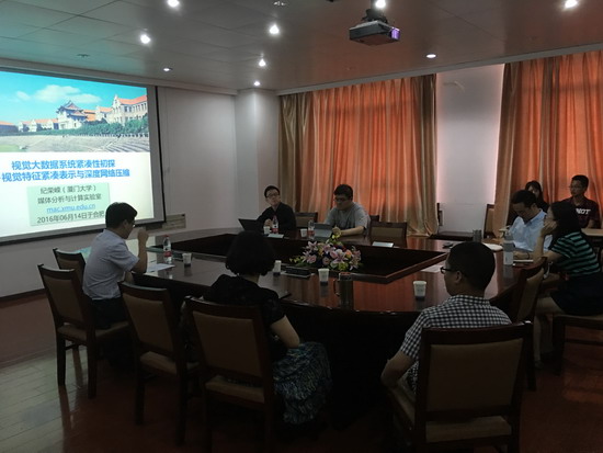 纪荣嵘教授介绍了近年来他领导研究团队在大规模媒体检索、深度学习建模与应用等领域的最新研究成果。在大规模检索部分,纪教授首先对哈希(hashing)方法的发展和现状做了简要介绍,并指出了当前众多方法的特色和局限性,进而介绍了一种面向排序的哈希模型构建方法。该方法不但被国际顶尖学术会议接受,并在国际竞赛上取得优异排名,也成功地应用于腾讯哼唱搜索之中。在深度学习模型构建部分,纪教授介绍了团队开发的一种深度神经网络压缩方法,并指出大规模深度神经网络可以在面向任务的前提下进行高效压缩或裁剪,可适用于移动电子设备端。