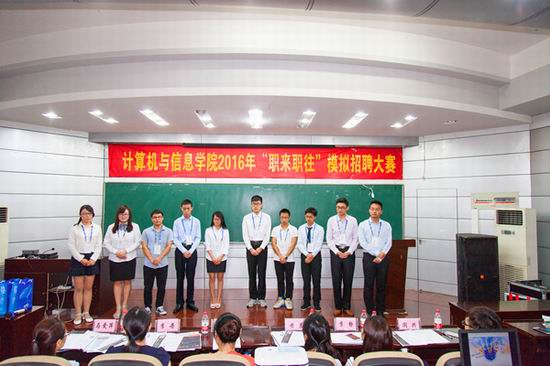 本次大赛共分两个环节,第一环节包含自我介绍、结构化面试和情景化面试三部分,主要对参赛选手进行专业技能、岗位认知、求职心态的综合考察;第二环节是无领导小组讨论,主要对参赛选手的语言表达、逻辑思维、团队合作、时间管理、应变能力等进行综合考察。进入决赛的10位参赛选手们通过社会实践、个人荣誉、求职意向、情景模拟等方面向观众们展现着最好的自己,用冷静的思索和精辟的分析赢得连连掌声。最终,计算机科学与技术专业胡岸获一等奖,计算机科学与技术专业王存和电子信息工程专业邓晓勇同学分列二、三位。