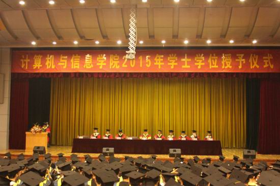 2015届毕业生学士学位授予决定》,全院共计530名同学被授予了工学学士学位。随后,校领导与学院学位评定委员会全体委员一起为全体学士学位获得者颁发学位证书,扶正流苏并合影留念。