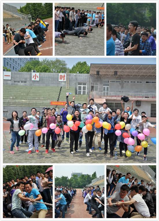 2010级14支班级代表队随即投入到趣味运动会的节目中去,趣味运动会分为“兔子跳”“螃蟹背西瓜”“团队默契”三个环节,各班级代表队都展示出强大的团队合作能力,默契配合能力和良好的身体素质。在一片欢乐的海洋中,趣味运动会成功进行。随后,便到了激动人心的拔河比赛,各班代表队摩拳擦掌,跃跃欲试,卯足了劲只为奋力一搏。当比赛的哨声响起,队员们使出浑身力气把绳子向后拉,绳子中间的红线左右摇摆,两边队员都整齐地往后倒、向后退。其他同学也在队伍旁边助阵加油,号子声、呐喊声,此起彼伏,飘荡在整个足球场上空。