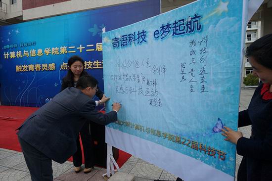 在翡翠湖校区一食堂广场隆重举行科技节系列活动开幕式。市科协主席金维平,校团委书记陈文恩,党委学工部副部长葛万锋,91网址