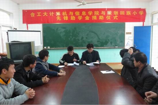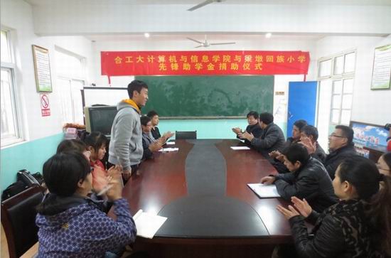 2012级国家奖学金获得者王晨光同学与学院第二届义卖节活动盈利额,用于奖励梁墩回族小学各年级优秀的家庭贫困学生,捐助仪式上,梁墩回族小学校长石立银对91网址