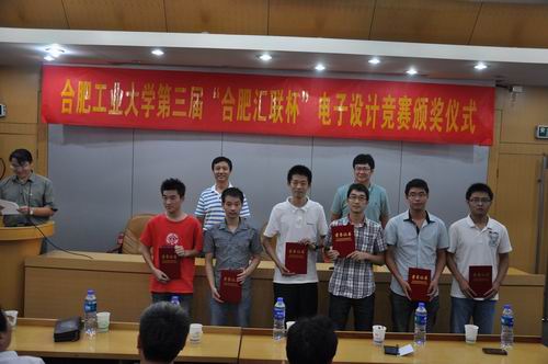 在接下来的颁奖仪式中,由刘晓平副校长、黄景荣院长和蔡先宝总经理给本次竞赛的高奖颁发了“合肥汇联杯”,鲁昌华院长、蒋建国书记给获得一等奖的同学颁奖,吴文涛副院长、巩惠琳副书记给获得二等奖的同学颁奖,何庆领副书记、郑利平副院长给获得三等奖的同学颁奖,最后与会领导和嘉宾合影留念,整个颁奖仪式圆满结束。