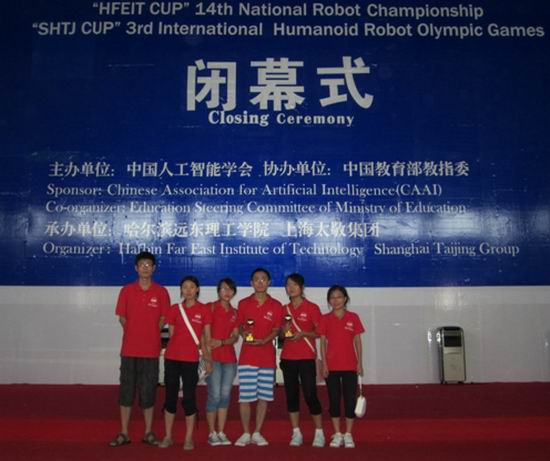 2012年7月24日-7月29日,“远东理工杯”第十四届全国机器人锦标赛暨“上海太敬杯”第三届国际仿人机器人奥林匹克大赛在冰城哈尔滨远东理工学院隆重举行。来自北京大学、哈尔滨工业大学、南京大学、华中科技大学、圣彼得堡科技大学、东国大学等中国、美国、加拿大、俄罗斯、韩国及多哥的70多所高校的近800人参加了该项比赛,其中第十四届全国机器人锦标赛是由国内高校参加,第三届国际仿人机器人加入了众多国际比赛队伍。我校8名“引擎”仿人机器人在方宝富副教授的指导和6名参赛队员的精心调试下,参加了双人舞蹈、单人舞蹈、阶梯跑、短跑、翻滚及四人芭蕾舞等6个项目的比赛,获得“远东理工杯”第十四届全国机器人锦标赛单人舞蹈、双人舞蹈二等奖。获得第三届国际仿人机器人奥林匹克大赛四人芭蕾舞蹈季军、机器人翻滚季军及单人舞蹈、双人舞蹈、阶梯跑、短跑二等奖。央视网CNTV和韩国媒体分别对我校队员薛健和陈金金进行了采访。李德毅院士饶有兴趣地观看了我校的四人芭蕾舞,并高度赞赏我校机器人的精彩表演。