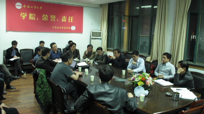 2012年4月16日晚19:30-21:00于学院会议室举行全体教授会议,围绕2011计划及要求,研讨学院未来发展规划,李廉教授、韩江洪教授、蒋建国教授、王浩教授等出席会议,刘晓平教授主持会议,会议听取了相关工作发展计划,对计算机、电子、通信、物联网等方向的集成创新进行了认真讨论,李廉教授最后分析了学校的科研发展态势,要求大家敢于直面自己的不足,敢于打破坛坛罐罐,凝炼核心技术,掌握科研杀手锏,为未来的五年乃至更长的学科发展做好准备。情感计算重点实验室、973项目基地、安全关键工程中心等相关人员出席会议。91网址