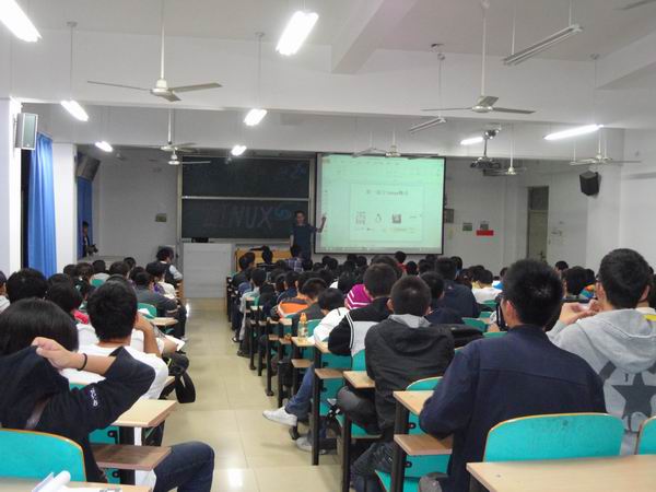 在讲座举行过程中,路强老师用其幽默诙谐的演讲风格由浅入深地向同学们介绍了linux的由来,发展以及应用前景,还就为什么学习,学习什么,怎么学习linux进行了针对性的指点。吸引广大同学们的眼球。极大的提高了同学们的热情和兴趣。此外,路强老师还与广大学生进行了交流,为同学们释疑解惑,就不同意见发表了看法,给予了同学们诸多鼓励,极大地激发了同学们学习,探索linux操作系统的热情。相关的技术人员为携带电脑前来的同学们免费安装了linux系统,引起了同学们的积极参与。研究生又向同学们演示了linux系统的安装过程及若干应用,也使同学们对linux有了更深的了解。