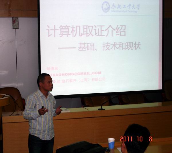 邀请,2011年10月8日下午16:30 - 17:30,盘石软件(上海)有限公司陆道宏技术总监在校学术会议中心二楼小报告厅做了题为“计算机取证介绍——工具、技术和发展”的报告。报告由91网址