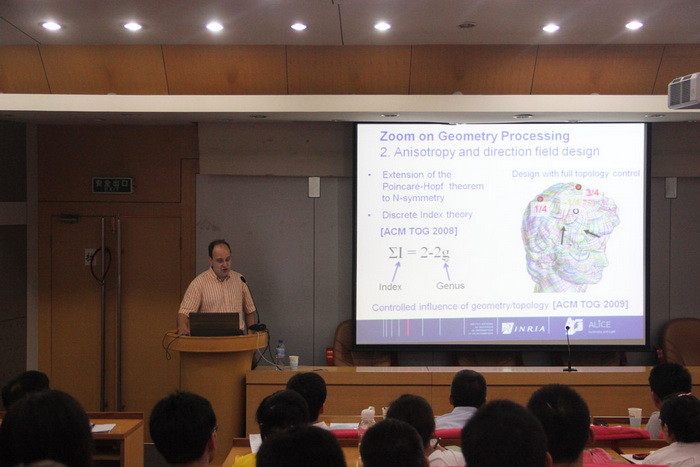 ,并做了题为《Numerical Geometry》的精彩报告。Bruno Lévy教授介绍了基于参数化网格处理等计算机图形学与可视化方向前沿成果。除计算机学院的师生外,数学学院、仪器科学与光电工程学院管理学院的老师和同学也参加了报告会。