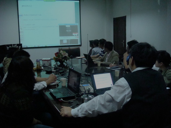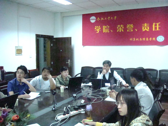 Candidacy exam于20:30正式开始。石慧首先以PPT的方式介绍了自己已做的研究工作和未来工作的规划,随后由各位评审针对其研究工作提问及考察其computer science有关的知识基础。刘晓平院长作为五位candidacy exam评审之一,通过学院便携式视频会议系统,与ODU大学当地的教授:Professor Maly、Professor Zubair、Professor Zeil、Professor Harris Wu一同参与了当晚的提问、评审工作。学院多名感兴趣的老师及同学也对整场candidacy exam 进行了观摩与学习。