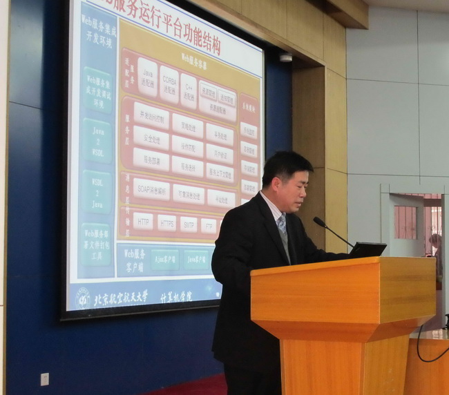 马殿富教授首先对照计算机行业出现的各种各样的技术预言,深入浅出地向在场师生解释了网格计算的发展历程,先后就服务计算、网格计算、CPS技术、云计算进行了介绍。接着从中间件技术、体系结构、需求背景、特征特性等多方面介绍了服务计算的发展。最后,马殿富教授全面而深入的介绍了网络计算的发展趋势。