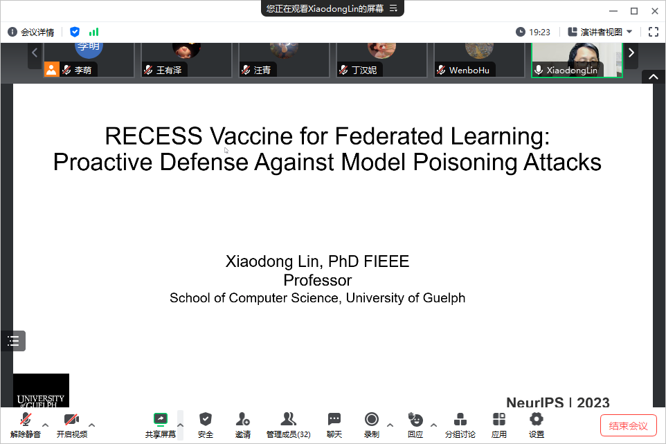 师生做了题为“RECESS Vaccine for Federated Learning: Proactive Defense Against Model Poisoning Attacks”的学术报告。李萌老师主持了本次报告会,学院相关研究方向的老师和学生参加了报告会。