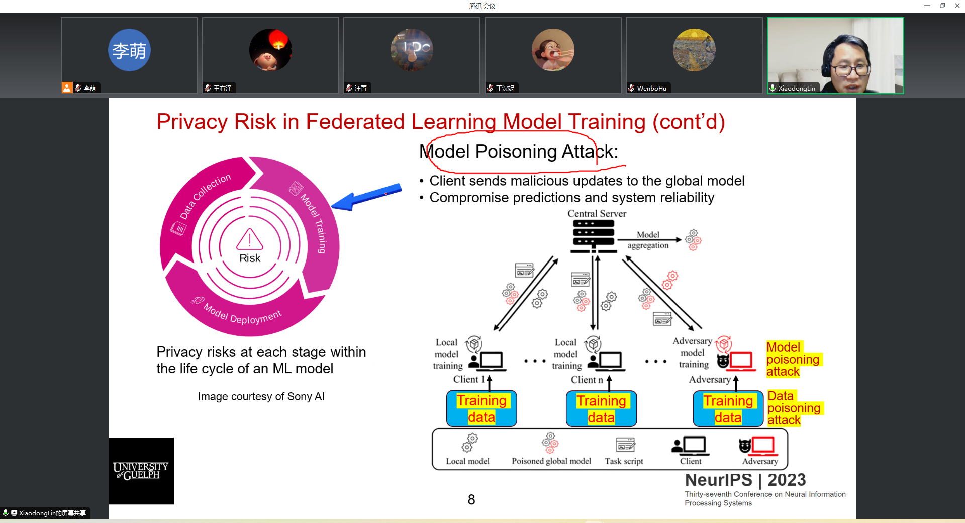 在报告会上,Lin老师介绍了其科研团队发表在NeurlPS2023上的最新科研成果。在报告结束后,李萌老师、顾辰老师和研究生与Lin老师讨论了投毒攻击防御和如何去加拿大读博等问题。