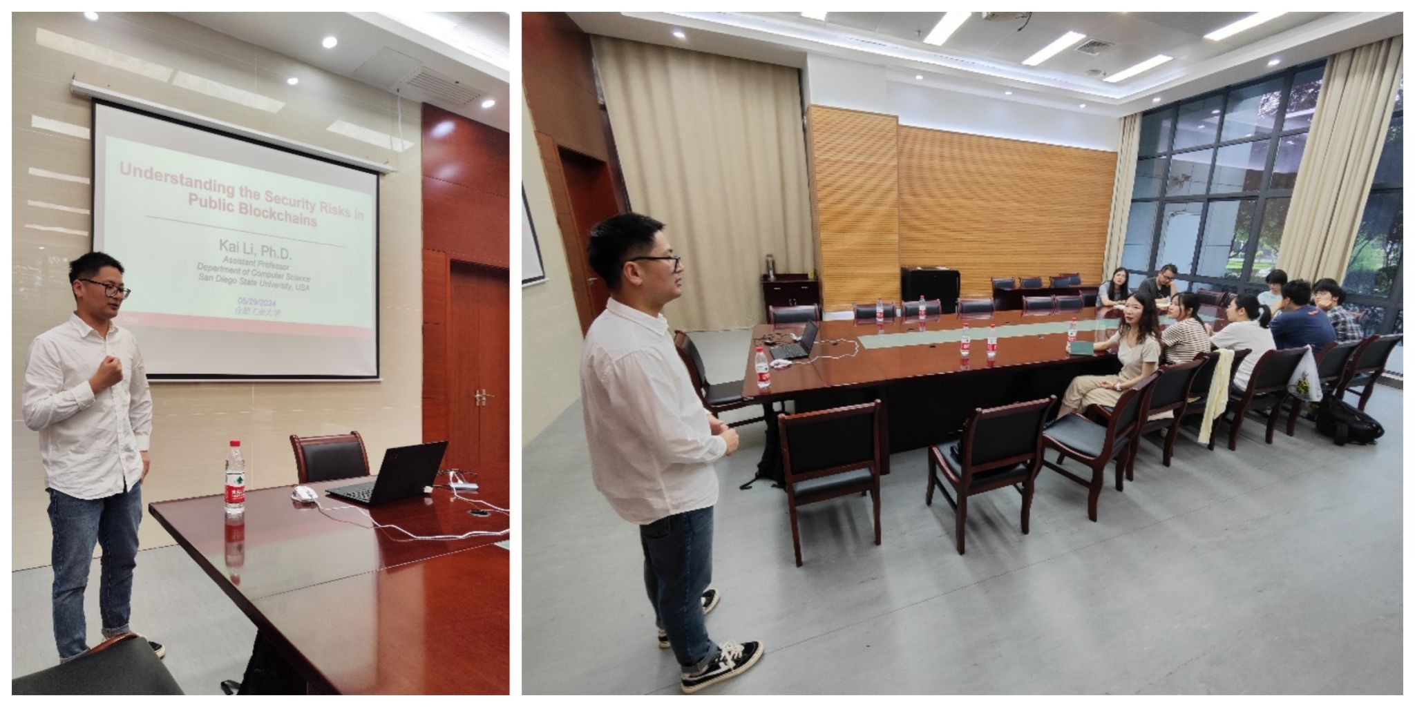 师生做了题为“Understanding the Security Risks in Public Blockchains”的学术报告。李萌老师主持了本次报告会,学院相关研究方向的老师和学生参加。