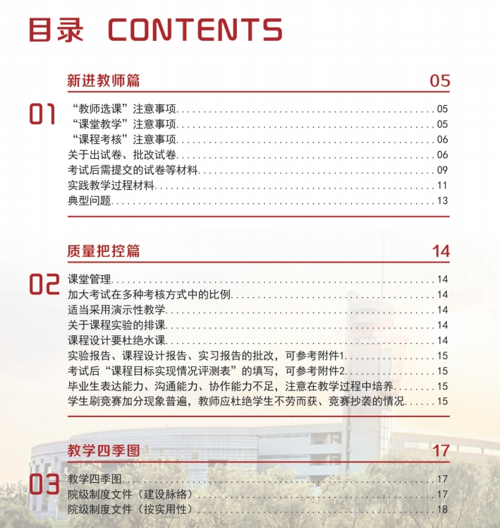 该手册包括“新进教师篇”、“质量把控篇”、“教学四季图”、“教学特色篇”和“教学发展篇”五个部分,涵盖了本科教学工作的各个环节,实操性强,干货满满,可以为学院全体教师提供教学指导和参考。