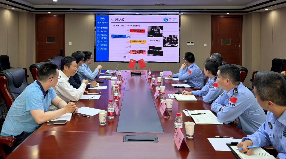 与合肥出入境边防检查站在科教楼A1106举行交流座谈会。合肥出入境边防检查站丰明副站长、边防检查处嵇德宝处长、总站边检处信息化王彦科长、合肥站执勤六队教导员蔡雷副处长、合肥站数据研判民警袁非副科长,学院吴共庆副院长、赵仲秋教授、卫星老师、杨毅老师等出席会议。会议由吴共庆副院长主持。
