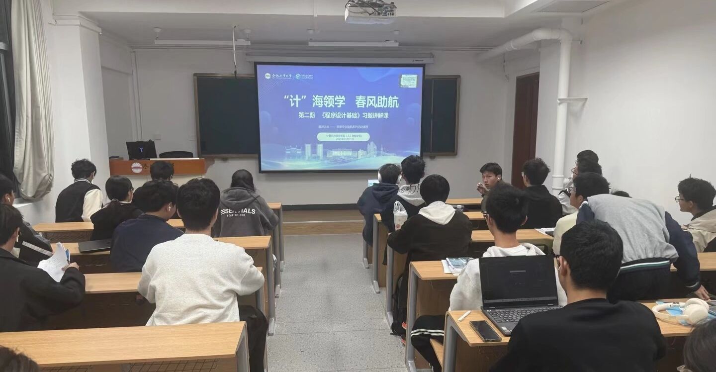 (人工智能学院)承办的以“线上线下巡回联动:《程序设计基础》朋辈辅导和集中答疑”为主题的第二期“计”海领学,春风助航活动在教学楼各班晚自习室成功举办。朋辈讲师团巡回主讲,学院大一新生参与活动。