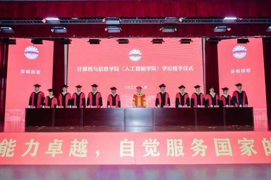 The degree awarding ceremony began with the majestic national anthem. Professor Wang Meng, chairman of the Degree Sub-Committee and dean of the School of Computer and Information (School of Artificial Intelligence), read out the "Decision on Awarding Degrees to the Graduates of the Class of 2023 of the School of Computer and Information (School of Artificial Intelligence)". Xue Ping and 11 others were awarded the Doctor of Engineering degree, Zhou Zhiyuan and 280 others were awarded the Master of Engineering degree, and Zhao Haobing and 504 others were awarded the Bachelor of Engineering degree. The leaders and teachers present at the meeting presented degree certificates to all degree recipients and adjusted their tassels.
