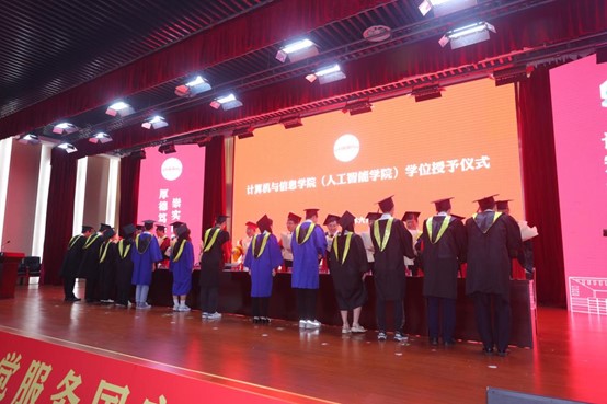 On June 15, the degree awarding ceremony for the 2023 graduates of the School of Computer and Information (School of Artificial Intelligence) was held in the lecture hall on the second floor of the Science and Education Building at the Feicui Lake Campus. Chen Gang, Deputy Secretary of the Party Committee of Hefei University of Technology, the leadership team of the college, members of the college degree evaluation committee, teacher representatives, and the 2023 doctoral, master's, and bachelor's degree recipients attended the degree awarding ceremony. The ceremony was presided over by Zhang Hailin, Deputy Secretary of the Party Committee and Secretary of the Discipline Inspection Commission of the College.