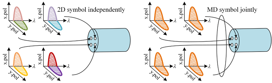Figure 1: Comparative Diagram of Traditional 2D Modulation and Multi-Dimensional Modulation in a Four-Core Optical Fiber Transmission System