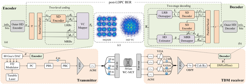 Figure 2: Experimental setup. Inset (a) shows the encoder of VC with MLC scheme. Inset (b) shows the decoder of VC with MLC scheme. Inset (c) shows the 2D projection of the constellations after 50 km transmission at the optimal launch power