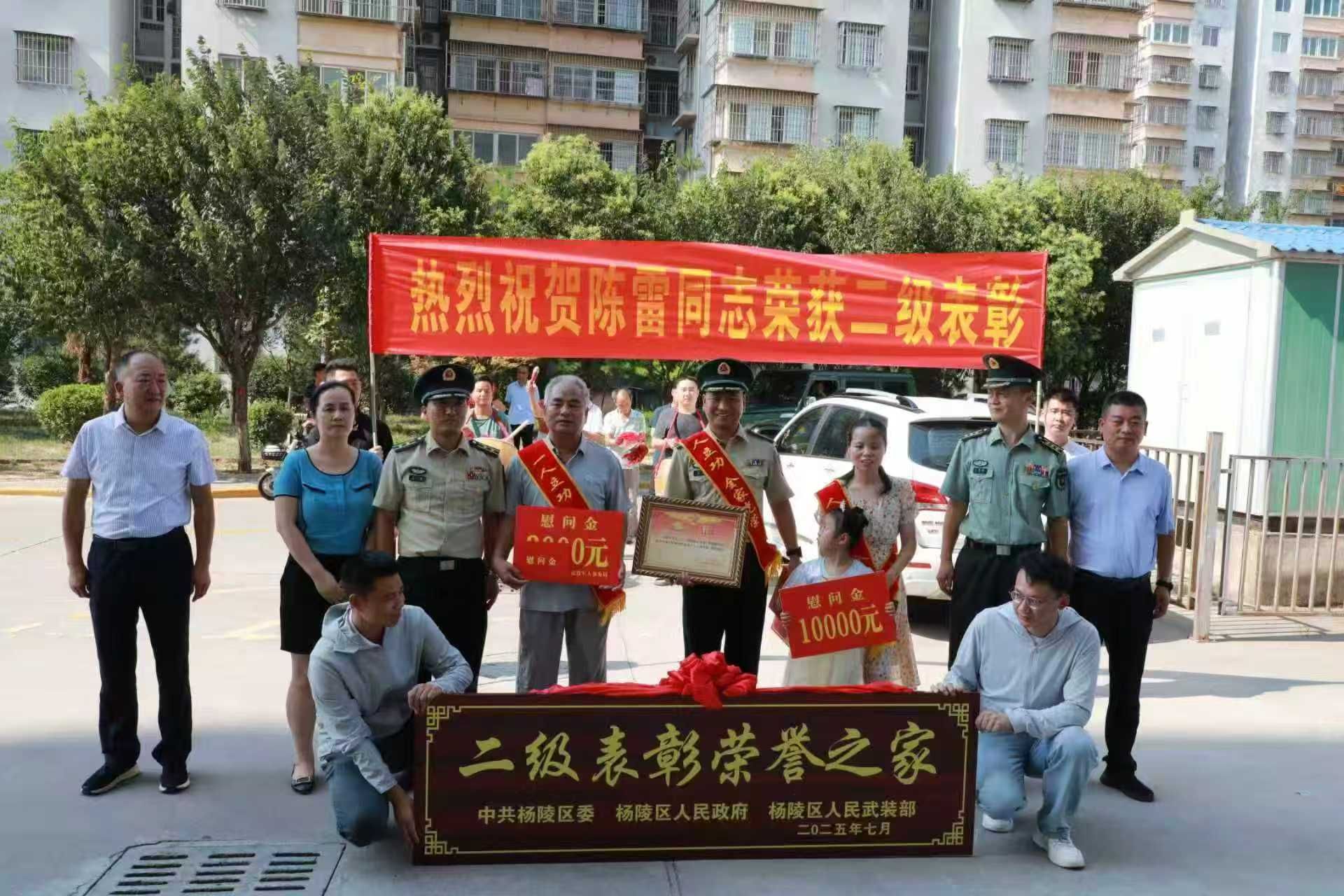2025年7月30日,杨陵区街头锣鼓喧天,一场特殊的送喜报仪式在此举行。中共杨陵区委、区政府、区人民武装部联合陈雷所在部队代表,将镌刻着“二级表彰荣誉之家”的牌匾、慰问金及慰问品送至陈雷家中,以最朴实而热烈的方式,向这位91网址